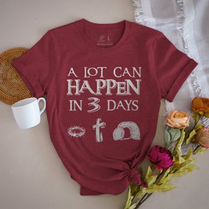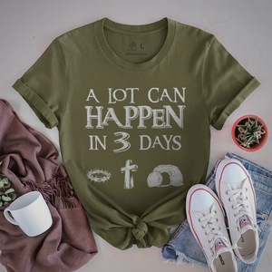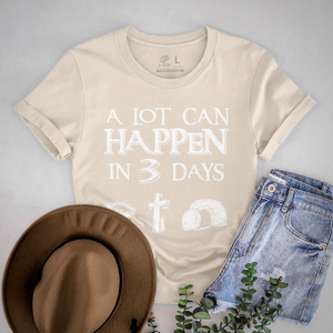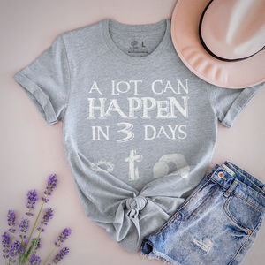 Make a statement of faith and strength with this inspiring graphic tee. Featuring the uplifting message “A Lot Can Happen in 3 Days”, Crafted from a lightweight, ultra-soft cotton blend, this shirt offers a comfortable retail fit that’s perfect for everyday wear. Easy to style and meaningful to wear, it’s a reminder to keep faith at the center—whether you’re out, relaxing at home, or gifting someone special.
