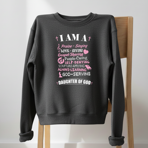 This cozy sweatshirt features typography design with the inspiring message, “Daughter of God” Made from soft, comfortable fabric with a relaxed crewneck fit, it’s perfect for everyday wear or layering on cooler days. The eye-catching design adds meaning and style while remaining easy to pair with any casual outfit. Ideal for personal wear or gifting, this sweatshirt is a warm reminder of faith, strength, and perseverance.