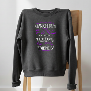 This cozy sweatshirt features typography design with the inspiring message, “Gods Way Grandchildren” Made from soft, comfortable fabric with a relaxed crewneck fit, it’s perfect for everyday wear or layering on cooler days. The eye-catching design adds meaning and style while remaining easy to pair with any casual outfit. Ideal for personal wear or gifting, this sweatshirt is a warm reminder of faith, strength, and perseverance.