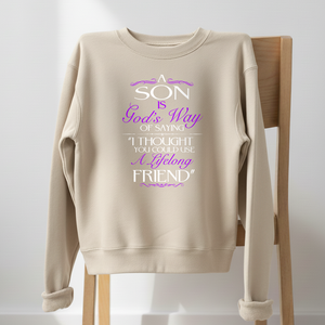 This cozy sweatshirt features typography design with the inspiring message, “Gods Way Son” Made from soft, comfortable fabric with a relaxed crewneck fit, it’s perfect for everyday wear or layering on cooler days. The eye-catching design adds meaning and style while remaining easy to pair with any casual outfit. Ideal for personal wear or gifting, this sweatshirt is a warm reminder of faith, strength, and perseverance.