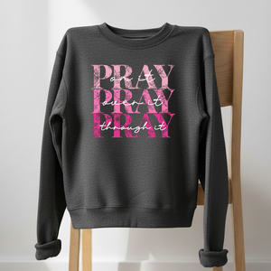 This cozy sweatshirt features typography design with the inspiring message, “Pray on it. Pray over it. Pray through it.” Made from soft, comfortable fabric with a relaxed crewneck fit, it’s perfect for everyday wear or layering on cooler days. The eye-catching design adds meaning and style while remaining easy to pair with any casual outfit. Ideal for personal wear or gifting, this sweatshirt is a warm reminder of faith, strength, and perseverance.