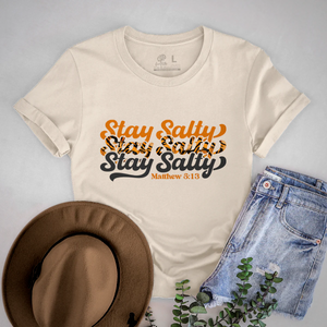 Make a statement of faith and strength with this inspiring graphic tee. Featuring the uplifting message “Stay Salty”, Crafted from a lightweight, ultra-soft cotton blend, this shirt offers a comfortable retail fit that’s perfect for everyday wear. Easy to style and meaningful to wear, it’s a reminder to keep faith at the center—whether you’re out, relaxing at home, or gifting someone special.